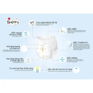 Ưu điểm nổi bật của Supdry vẫn nằm ở độ Mềm – Mỏng và Thoáng khí. Sản phẩm chỉ dày tầm 3mm với hàng ngàn lỗ thông hơi trên bề mặt giúp cho bỉm như đang được “Thở” khi bé sử dụng.