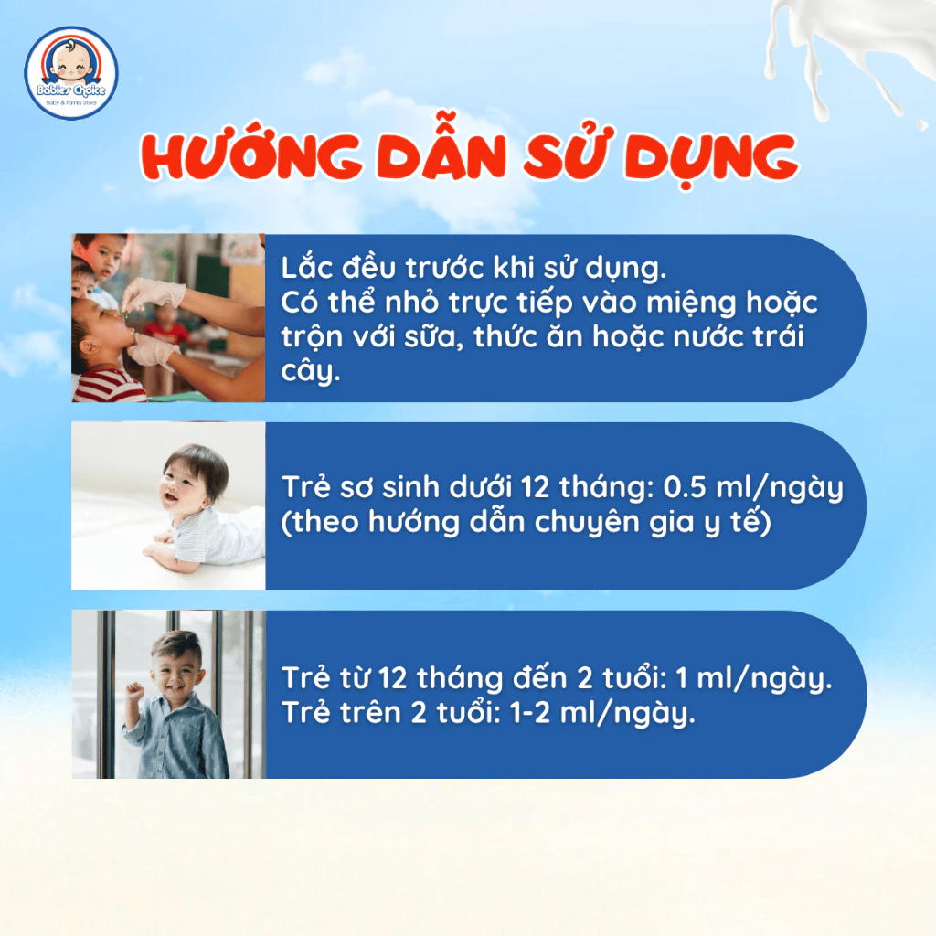 – Trẻ sơ sinh dưới 12 tháng: 0.5 ml/ngày (theo hướng dẫn chuyên gia y tế).