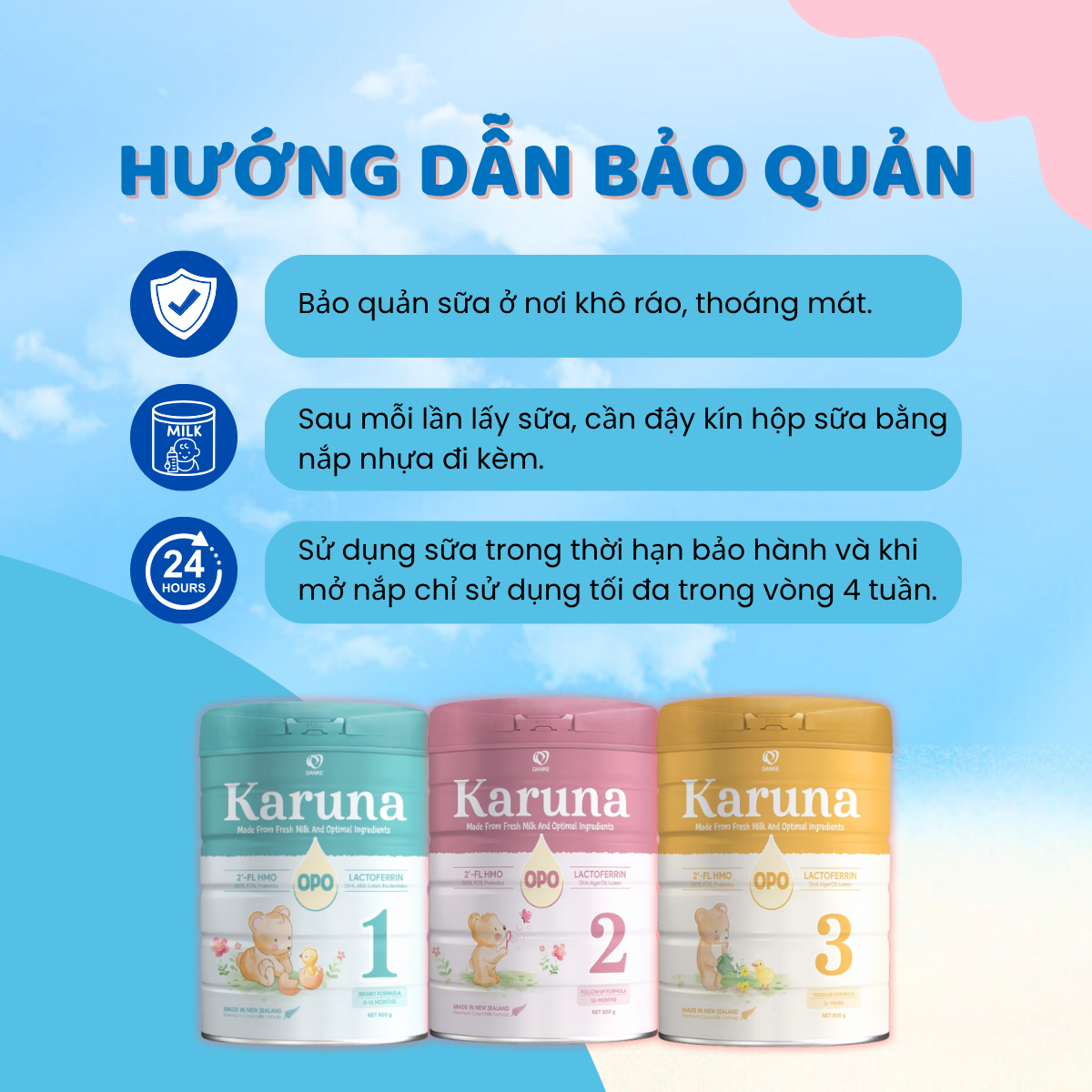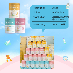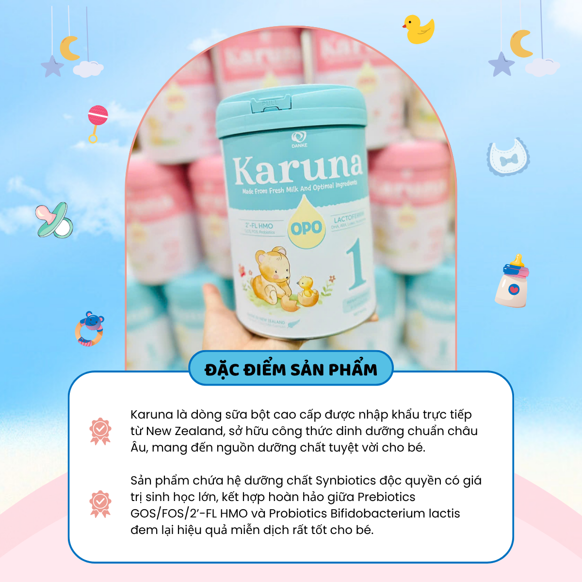 – Karuna là dòng sữa bột cao cấp được nhập khẩu trực tiếp từ New Zealand, sở hữu công thức dinh dưỡng chuẩn châu Âu, mang đến nguồn dưỡng chất tuyệt vời cho bé.