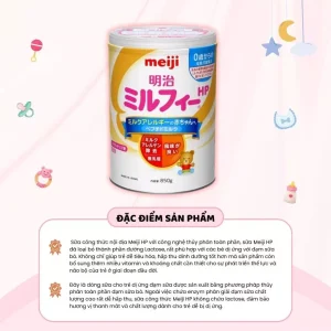 – Sữa công thức nội địa Meiji HP với công nghệ thủy phân toàn phần, sữa Meiji HP đã loại bỏ thành phần đường Lactose, rất phù hợp với các bé dị ứng với đạm sữa bò. Không chỉ giúp trẻ dễ tiêu hóa, hấp thu dinh dưỡng tốt hơn mà sản phẩm còn bổ sung thêm nhiều vitamin và khoáng chất cần thiết cho sự phát triển thể lực và não bộ của trẻ ở giai đoạn đầu đời.