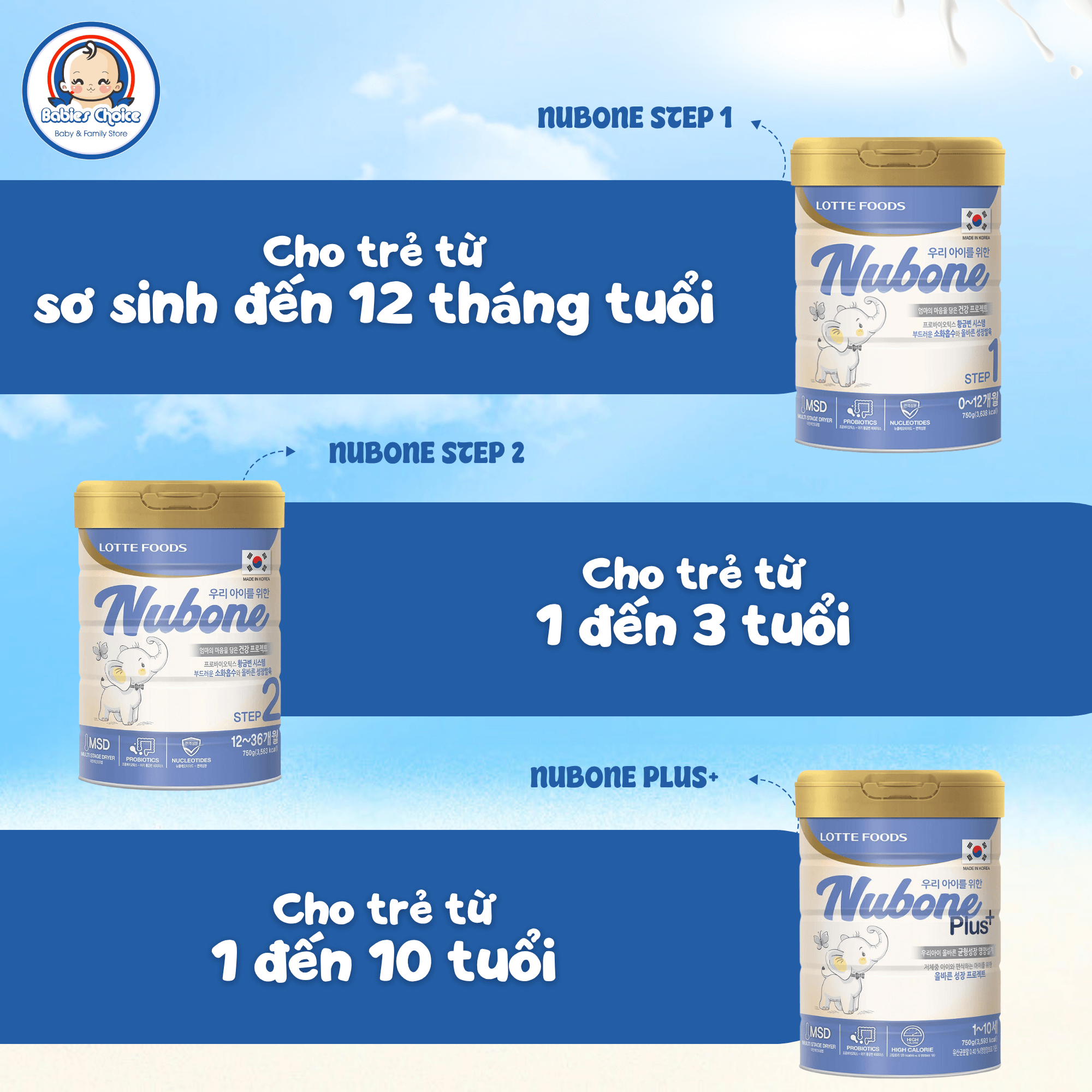 – Nubone Step 1 dành cho trẻ sơ sinh đến 12 tháng tuổi.