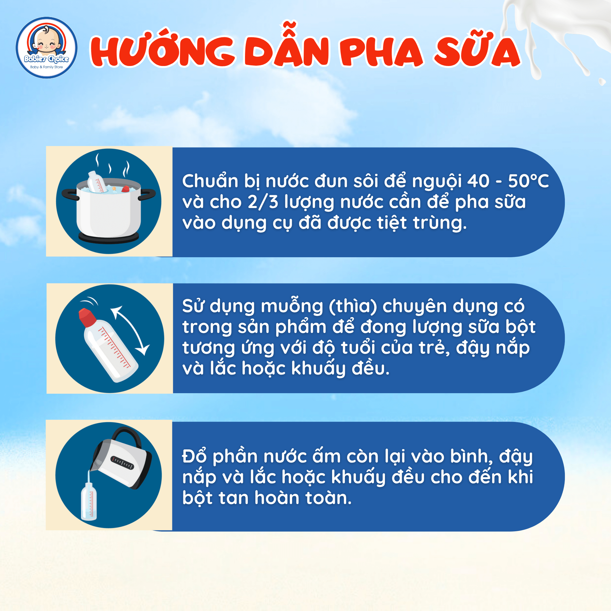 – Sử dụng muỗng (thìa) chuyên dụng có trong sản phẩm để đong lượng sữa bột tương ứng với độ tuổi của trẻ, đậy nắp và lắc hoặc khuấy đều.