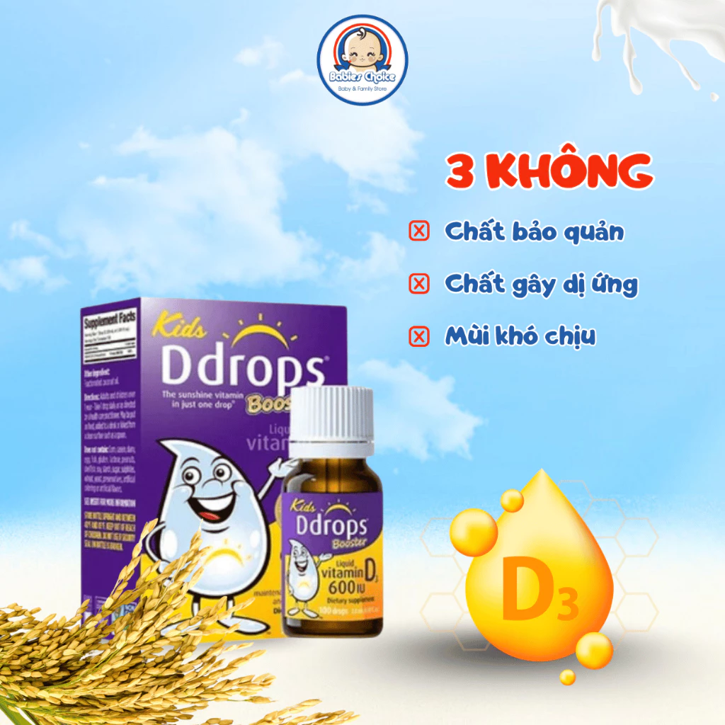 – Vitamin D3 của thương hiệu Ddrops Booster giúp bổ sung vitamin D3 cho bé, giúp hỗ trợ hấp thu canxi và phát triển xương răng tốt hơn.