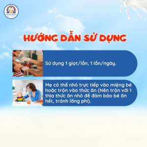 – Mẹ có thể nhỏ trực tiếp vào miệng bé hoặc trộn vào thức ăn (Nên trộn với 1 thìa thức ăn nhỏ để đảm bảo bé ăn hết, tránh lãng phí).